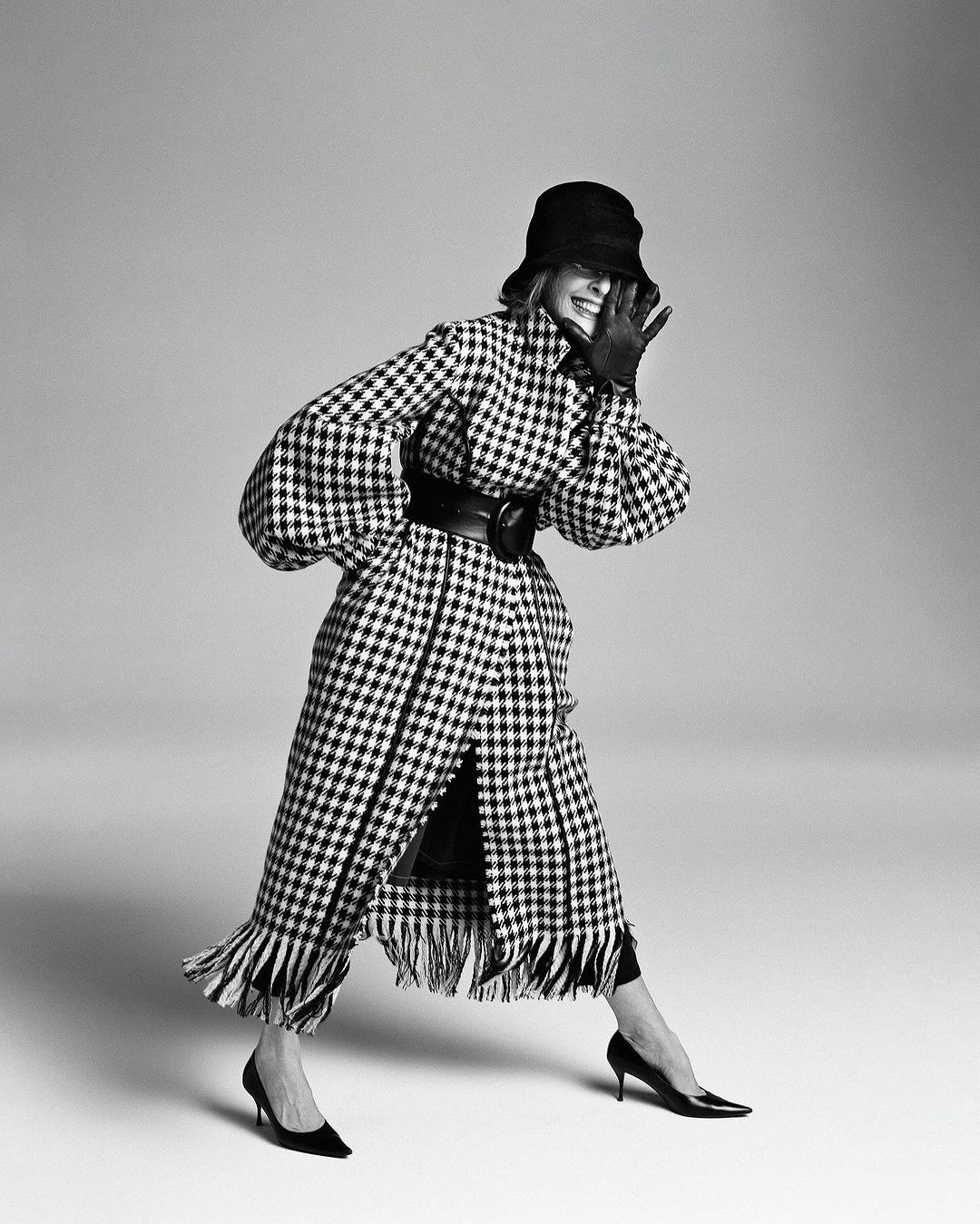 Keaton’s most unique silhouette with tailored trousers, oversized coats, and statement belts. The output? A graceful, eye-catching look.
